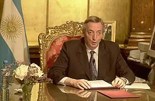![]() Néstor Kirchner como presidente hablando por cadena nacional, junio de 2003. | |||||