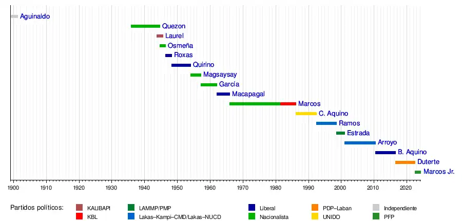 Entre 1901 y 1935, el poder ejecutivo en las Filipinas era ejercido por una sucesión de cuatro militares estadounidenses, Gobernadores Generales, y once gobernadores generales civiles. Tras el acuerdo para una independencia gradual de diez años del archipiélago, en octubre de 1935, fue elegido mediante sufragio universal Manuel L. Quezón como Presidente de la Mancomunidad Filipina que había sido establecida bajo una constitución ratificada el 14 de mayo de ese año. Inicialmente el mandato era de seis años sin posibilidad de reelección, pero la constitución fue modificada en 1940 para permitirle a Quezón la reelección, reduciendo el mandato a cuatro años. Cuando el presidente Quezón se exilió en los Estados Unidos después de que las Filipinas cayeron ante el Imperio del Japón en la Segunda Guerra Mundial, nombró al Presidente del Tribunal Supremo José Abad Santos como Presidente en funciones y, como interino Comandante en Jefe de las Fuerzas Armadas. Abad Santos fue ejecutado posteriormente por el Ejército Imperial Japonés el 2 de mayo de 1942. Teóricamente, Quezón continuó siendo Presidente de jure en el exilio hasta su muerte en agosto de 1944.