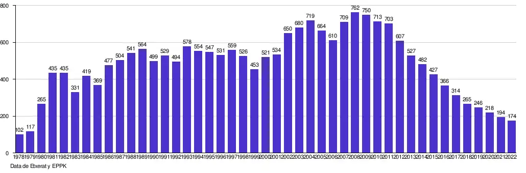 Los datos del gráfico se han tomados de Etxerat, la asociación de familiares de estos presos,[4][5][6][7] y del EPPK.[8] Cabe señalar que algunos presos deciden no formar parte de Etxerat, o bien han sido expulsados, por lo que el número de presos del Movimiento de Liberación Nacional Vasco es de aproximadamente el 7% superior a esos datos. Por ejemplo, en el 2005 Etxerat comunicó que los presos que se encontraban en las prisiones españolas eran 507, mientras que el servicio penitenciario español declaró que había 544 presos relacionados con ETA.[9]
