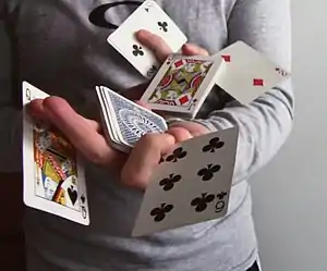 El arte de lanzar cartas generalmente consiste en lanzar cartas estándar con una velocidad y precisión excesivamente altas, lo suficientemente poderosas como para cortar frutas como zanahorias e incluso melones.[24][25] Al igual que el floreo, lanzar cartas está destinado a ser visiblemente impresionante y no incluye elementos mágicos.[25] El mago Ricky Jay popularizó el lanzamiento de cartas dentro de la industria de los juegos de manos con el lanzamiento de su libro de 1977 "Cards as Weapons", que obtuvo grandes ventas y elogios de la crítica.[26] Algunos trucos de magia, tanto en primer plano como en el escenario, están muy relacionados con el lanzamiento de cartas.[27]