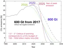 De acuerdo con el Informe especial de 2018 sobre el calentamiento global de 1,5 °C del IPCC, el Instituto de Investigación Mercator sobre los Bienes Comunes Globales y el Cambio Climático estima que el presupuesto de CO2 asociado con 1,5 °C de calentamiento se agotará en 2028 si las emisiones se mantienen en el nivel actual de finales de la década de 2010.[8] Más allá de un aumento de temperatura de 1,5 °C, aumenta el riesgo de consecuencias duraderas e irreversibles del cambio climático.[9]