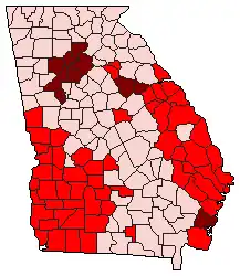 Un mapa de los condados ganados por cada candidato en las primarias republicanas de Georgia, 2008.