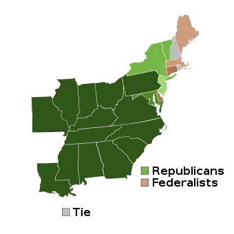 Los federalistas promovieron el sistema financiero del Secretario del Tesoro, Alexander Hamilton, que enfatizó la asunción federal de las deudas estatales, un arancel para pagar esas deudas, un banco nacional para facilitar el financiamiento y el fomento de la banca y la fabricación. Los demócratas-republicanos, con sede en las plantaciones del Sur, se opusieron a un fuerte poder ejecutivo, fueron hostiles a un ejército y una armada permanentes, exigieron una lectura estricta de los poderes constitucionales del gobierno federal y se opusieron firmemente al programa financiero de Hamilton. Quizás su diferencia más importante fue en la política exterior, donde los federalistas favorecieron a Gran Bretaña debido a su estabilidad política y sus estrechos vínculos con el comercio estadounidense, mientras que los republicanos admiraban la revolución francesa y la primera república. Jefferson temía especialmente que las influencias aristocráticas británicas socavaran el republicanismo. Gran Bretaña y Francia estuvieron en guerra desde 1793 hasta 1815, con solo una breve interrupción. La política estadounidense era neutral, con los federalistas hostiles a Francia y los republicanos hostiles a Gran Bretaña. El Tratado de Jay de 1794 marcó la movilización decisiva de los dos partidos y sus partidarios en todos los estados. El primer presidente estadounidense, George Washington (1789-1797), aunque oficialmente no partidista, generalmente apoyó a los federalistas y ese partido convirtió a Washington en su héroe icónico.[3] Sin embargo, el partido se desvaneció por completo en medio de la oleada de patriotismo general suscitado por la Guerra anglo-estadounidense de 1812. Los federalistas se volvieron muy impopulares por su oposición a la guerra contra Gran Bretaña, máxime cuando, en una convención que celebraron en Hartford (Connecticut), llegaron a amenazar con la secesión de Nueva Inglaterra si se iba a la guerra «contra la nación de la que descendemos». Éstas y otras iniciativas contra la guerra hundieron irreversiblemente a los federalistas, pues a ojos de los votantes aparecían como «desleales y localistas». En consecuencia, el Partido Federalista desapareció durante la Era de los Buenos Sentimientos (1816-1824). Los demócratas-republicanos también perdieron la unidad, y entre 1824 y 1828, cuando surgió el Segundo Sistema de Partidos, el Partido Demócrata-Republicano se dividió en la facción Jacksoniana, que se convirtió en el moderno Partido Demócrata en la década de 1830, y en la facción de Henry Clay, que fue absorbida por el Partido Whig.
