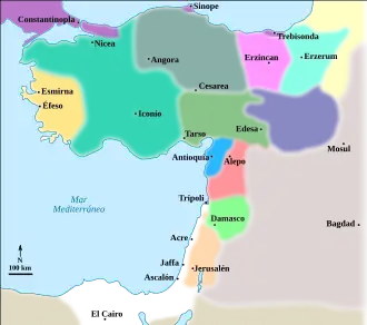 Anatolia y Siria se hallaban bajo dominio de los selyúcidas suníes, que antiguamente habían formado un gran imperio, pero que en ese momento estaban divididos en Estados más pequeños. El sultán Alp Arslan había derrotado al Imperio bizantino en la batalla de Manzikert, en 1071, y había logrado incorporar gran parte de Anatolia al imperio.[4] Sin embargo, el imperio se dividió tras su muerte al año siguiente. Malik Shah I sucedió a Alp Arslan y continuaría reinando hasta 1092, periodo en el que el imperio selyúcida se enfrentaría a la rebelión interna. En el Sultanato de Rüm, en Anatolia, Malik Shah I sería sucedido por Kilij Arslan I, y en Siria por su hermano Tutush I, que murió en 1095. Los hijos de este último, Radwan y Duqaq, heredaron Alepo y Damasco, respectivamente, dividiendo Siria todavía más entre distintos emires enfrentados entre ellos y enfrentados también con Kerbogha, el atabeg de Mosul.[7] Todos estos Estados estaban más preocupados en mantener sus propios territorios y en controlar los de sus vecinos que en cooperar entre ellos para hacer frente a la amenaza cruzada.