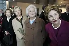 De izquierda a derecha: Rosalynn Carter, la entonces Senadora Hillary Clinton, Barbara Bush y la primera dama Laura Bush en el Parque y Centro Presidencial William J.Clinton en 2004.