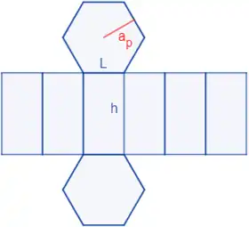 El área de un prisma hexagonal recto es la suma de las áreas de las caras laterales (rectangulares) y de las áreas de las bases (hexagonales). Si la altura del prisma es y el lado de la base es , el área del prisma es[1]