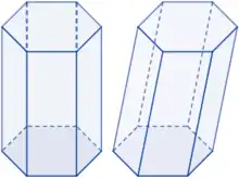 ![]() Prisma hexagonal recto (izquierda) y oblicuo (derecha) |