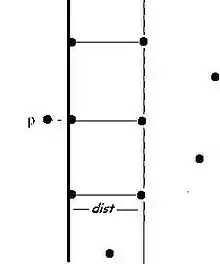 - Seleccionar los puntos de la parte derecha e izquierda que están a una distancia horizontal menor que dLRmin de la recta divisoria entre ambos. Aprovechar que los puntos están ordenados para elegir los últimos puntos de la parte izquierda y los primeros de la parte derecha.