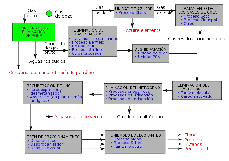 Existe una gran variedad de formas de configurar los distintos procesos unitarios utilizados en el tratamiento del gas natural bruto. El diagrama de flujo de bloques que figura a continuación es una configuración típica generalizada para el tratamiento de gas natural bruto procedente de pozos de gas no asociado. Muestra cómo se procesa el gas natural bruto para convertirlo en gas de venta canalizado a los mercados de usuarios finales.[13][14][15][15][16] También muestra cómo el procesamiento del gas natural bruto produce estos subproductos: