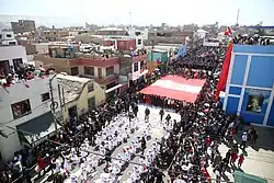 Con el permiso, el 28 de julio de 1901, se realiza. Al llegar la bandera fue llevada por calles poco concurridas de la ciudad[3] para posteriormente ser fue bendecida en esa iglesia con una misa en la iglesia San Ramón a cargo del párroco Alejandro Manrique, quien bendice la bandera recitando la oración "La Cruz y la Bandera". Concluida la misa, los integrantes de la sociedad transportan en procesión la bandera desde el templo, continua por la calle Unanue, hasta su local en Alto Lima. La población peruana de Tacna y Arica la acompaña en silencio por las calles de Tacna. Finalmente en el local de la sociedad el poeta Federico Barreto declama un poema a la bandera. A partir de esa fecha esta sería la única celebración pública de las fiestas patrias peruanas en las provincias de Tacna y Arica. Tras ser llevada por las calles céntricas de la ciudad, llegó al local de la Benemérita Sociedad de Artesanos y Auxilios Mutuos El Porvenir.[5]