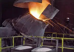 Entonces, se agregan adiciones de cal para diluir el azufre en el baño de metal. Además, se puede agregar aluminio o silicio para eliminar el oxígeno, y otras adiciones de aleación de recorte al final del paso. Una vez que se han alcanzado los niveles de azufre deseados, la escoria se elimina del recipiente AOD y el baño de metal está listo para colarse. A continuación, el baño de metal fundido se envía a una estación de agitación para una mayor reducción de elementos químicos o a un equipo de colada para su fundición.