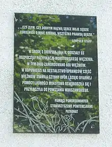 Cuando estalló el levantamiento, había 794 presos en la prisión de Mokotów, en la calle Rakowiecka 37, entre ellos 41 menores.[17] El 1 de agosto, el edificio fue atacado por soldados del Ejército Nacional que lograron entrar a la prisión y ocupar el edificio administrativo, pero no pudieron llegar a los edificios penitenciarios.[18]