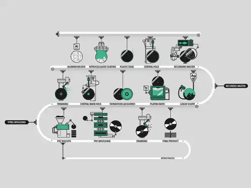 Los discos se fabrican en grandes plantas industriales, ya sean propiedad de las principales discográficas o dirigidas por operadores independientes a los que las compañías menores y los sellos independientes se dirigen para realizar tiradas más pequeñas. Una banda que está comenzando puede obtener algunos cientos de discos, mientras que los artistas con grandes ventas necesitan que las prensas funcionen a tiempo completo para fabricar los cientos de miles de copias necesarias para el lanzamiento de un gran álbum. Para la mayoría de las bandas de hoy, utilizando cualquiera de las grandes plantas de fabricación, no es rentable producir menos de mil copias. Realizar tiradas más cortas eleva el costo de producción casi prohibitivamente, debido a que los costos iniciales para hacer un disco son elevados en comparación con los costos iniciales para producir un disco compacto.