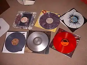 Si bien los discos generalmente se imprimen en vinilo negro liso, el álbum en sí tiene un aspecto mucho más ornamental. Esto puede incluir un color sólido (que no sea negro), decoración con salpicaduras, una apariencia de mármol o transparencia (ya sea incolora o teñida de un color). Algunos ejemplos de esto se pueden ver en la imagen de la derecha. Uno de los ejemplos más conocidos de esta técnica es la impresión en vinilo blanco del White Album de The Beatles.