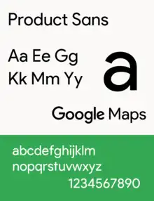 El logotipo actual de Google está basado en Product Sans. Existen ligeras modificaciones en el logotipo en comparación con la tipografía: la más notable es la 'e' inclinada. Las diferencias entre el logotipo y Product Sans permiten distinguir entre el logotipo de Google y el nombre del producto.[1] Product Sans se usa principalmente en el texto de los logotipos de numerosos servicios de Google, como Maps, Drive, News, Earth, etc. La fuente también se usa en Google Store, y en algunas versiones de Android.