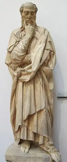 El personaje de la estatua no ha sido claramente identificado por la falta de atributos iconográficos, por lo que es llamado por el nombre convencional de Profeta pensativo, a causa del gesto que realiza con la cabeza baja y la mano apoyada en el mentón. La estatua se caracteriza por un gran realismo y una profunda intensidad en la expresión con un sentido de la energía retenida como las mejores obras de Donatello.