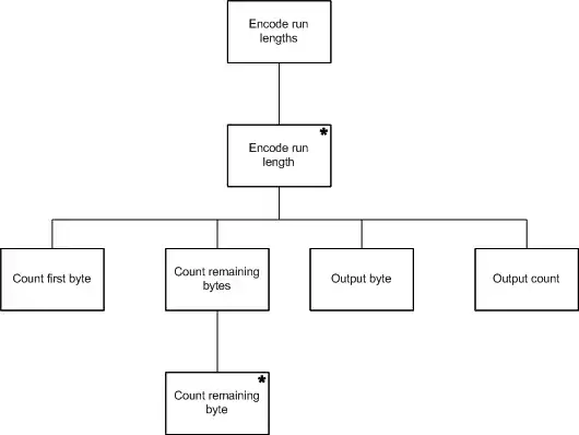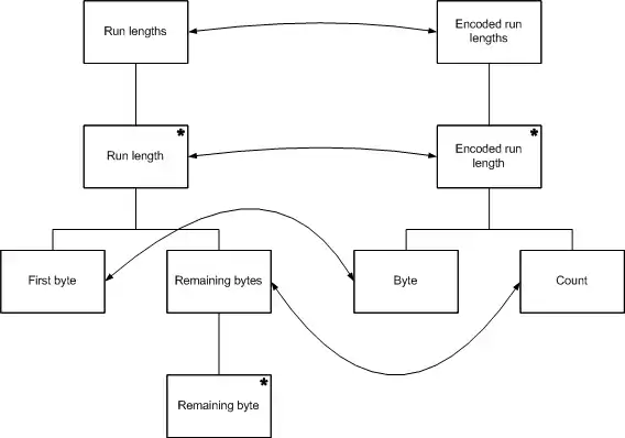 Con JSP, el primer paso es describir la estructura de las entradas de un programa. Un codificador de longitud de ejecución solo tiene una entrada, una cadena de bytes que se pueden ver como cero o más carreras. Cada ejecución se compone de uno o más bytes del mismo valor. Esto está representado por el siguiente diagrama JSP.