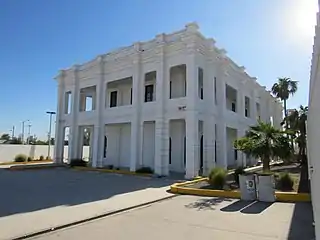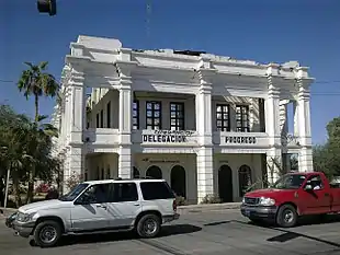 ![]() Edificio histórico que albergó a la delegación municipal "Progreso". Esta es una imagen de las caras oeste, a la izquierda en la foto; y sur, a la derecha. La cara sur es la que yace paralela a la carretera federal 2, que va de Mexicali a Tijuana. En esta imagen del 2017 el edificio se encuentra reconstruido después de haber sido abandonado tras el terremoto del 2010.