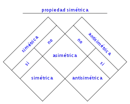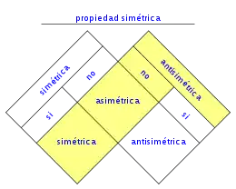 En una relación binaria homogénea la simetría determina la posible de que si un elemento a está relacionado con otro b el b este relacionado con el a, en todos los casos, nunca o a veces.