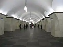 Diseñada por V. Lebedev y P. Shteller, la estación cuenta con pilares acampanados recubiertos de mármol blanco y adornados con cornisas afiladas de metal. Las paredes están recubiertas de azulejos de cerámica blanca con líneas horizontales negras.[1]