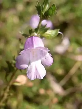 Se trata de un arbusto humilde, desparramado y muy ramificado con las ramas y ramitas subcilíndricas y más raramente subcuadrangulares. Es habitualmente densamente glandular-pubescente con pelos pedicelados glandulares y no glandulares. Sus hojas, sin pedicelo o con uno milimétrico, son de color verde claro, viscosas, fuertemente aromáticas al chafarlas, y con el limbo ovalado a elíptico de 5-9 mm de largo por 1-3 de ancho, generalmente densamente cubierto de glándulas pediceladas. Tienen los márgenes con 2-4 lóbulos/dientes obtusos, ocasionalmente enteros, y de ápice también obtuso. La inflorescencia es un racimo frondoso con 2-10 flores. Estas últimas tienen el cáliz verde, interior y exteriormente poco o mucho pubescente-glandular, el tubo de 2-4 mm de largo, bilabiado con el lóbulo inferior ovalado entero y el superior desde ovalado entero o oscuramente subtrilobulado hasta emarginado con un sinus de 1,5-2 mm. La corola, bilabiada con el labio superior discretamente bilobulado y el inferior profundamente trilobulado (con el lóbulo mediano espatulado y algo bífido) mide 9-15 mm de largo y es de color malva con manchas amarillentas y pardas en la garganta; mientras que en la base del lóbulo inferior mediano hay una fila irregular de manchas amarillentas bordeada de puntos marrón a anaranjado y, lateralmente, de puntos violeta/purpúreo. El interior de dicha corola es glabro -excepto la garganta y la base de los lóbulos- y el exterior puede ser también glabro o moderadamente/ligeramente peludo distalmente. Los 4 estambres tienen filamentos mediocentimétricos con las anteras provistas de una pequeña protuberancia basal, y el conectivo lleva un apéndice basal de 1,5-2 mm terminado con 1-5 tricomas estrechamente triangúlares. El pistilo es centimétrico, con ovario cilíndrical-obovoide y estilo bífido. Los 4 mericarpos miden unos 2-2,5 mm de largo y son apicalmente dilatados (1mm en la base y 2,5-3 mm en el ápice).[3][4][5][2][1]
