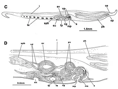 Los poros masculino y femenino están claramente separados y situados detrás de la faringe. Aparato masculino con vesícula seminal orientada anteriormente, y dos vesículas prostáticas esféricas, con un epitelio glandular liso y cubierto con un revestimiento muscular grueso. El conducto deferente se abre separadamente en la vesícula seminal. Los conductos eyaculatorio y prostático son muy largos, y en forma de espiral. Papila peniana corta y armada con estilete tubular afilado. Aparato genital femenino situado posterior al poro masculino, y se caracteriza por un atrium corto en forma de huso, una bolsa glandular de cemento, y una vagina y útero orientados hacia atrás.[4]