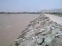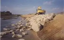- recubriendo las márgenes, en la franja donde oscila el agua de un sistema denominado generalmente como enrocado (rocas sueltas acomodadas en forma más o menos irregular en el talud a ser protegido). Este método es muy usado en los taludes aguas arriba de las presas hidráulicas;
