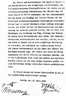 En la madrugada del 15 de marzo, el presidente checoslovaco Emil Hácha fue invitado a la Cancillería del Reich, recién inaugurada, en Berlín. Allí, Hitler y Göring lo amenazaron con bombardear Praga a menos que el ejército checoslovaco se rindiera. La maniobra funcionó, y en la mañana de ese mismo día, las tropas alemanas entraron sin resistencia a Bohemia y Moravia. Al día siguiente, desde el Castillo de Praga, Hitler proclamó la creación del Protectorado de Bohemia y Moravia.[1]