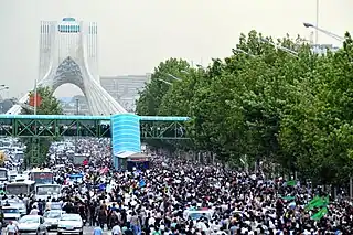 El 14 de junio, decenas de miles de personas se reunieron en una zona céntrica de Teherán para celebrar la reelección del presidente Mahmud Ahmadineyad.[31]