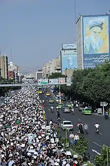 Tras las elecciones presidenciales en Irán de junio de 2009, se llevaron a cabo protestas en Teherán y otras importantes ciudades en Irán y de todo el mundo contra el presunto fraude electoral y en apoyo del candidato de la oposición Mir Hosein Musaví y Mehdí Karrubí.[1] En respuesta, otros grupos se han manifestado en Teherán en apoyo a la supuesta victoria de Mahmud Ahmadineyad.[2] Las protestas en curso han recibido varios títulos, como "Revolución Verde", debido al color usado durante la campaña electoral por Musaví; "Revolución del Parque de la Libertad"[cita requerida], debido a la ubicación de las protestas en Teherán; "Despertar Persa" también ha sido utilizado por algunos comentaristas iraníes y también por los manifestantes[cita requerida]. En medios gubernamentales iraníes opuestos a las protestas, estas son conocidas como «la fitna del 88» (por el año 1388 del calendario persa, coincidente con 2009-2010: فتنه ۸۸, trsc. fetné-ye hashtad o hasht).[3]