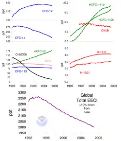 Desde que el Protocolo de Montreal entró en efecto, las concentraciones atmosféricas de los clorofluorocarburos más importantes y los hidrocarburos clorinados se han estabilizado o se ha reducido. La concentración de halones ha continuado en aumento a medida que los halones que se encuentran almacenados en los extinguidores de incendio son liberados. Sin embargo, la tasa de aumento ha disminuido y se espera que comience a declinar su presencia hacia el 2020. La concentración de los HCFC ha aumentado significativamente, en gran parte debido a los múltiples usos en los que reemplazan a los CFC (por ejemplo, como solventes o refrigerantes). A pesar de que ha habido informes sobre individuos quienes intentan evitar la prohibición por medio del contrabando desde países en vías de desarrollo hacía los desarrollados, el grado de cumplimiento con el Protocolo ha sido enorme. Por ello, el Protocolo de Montreal ha sido considerado el acuerdo ambiental internacional más exitoso del mundo hasta la fecha. En un informe del 2001, la NASA halló que el debilitamiento del ozono sobre la Antártida se había mantenido igual al de los 3 años anteriores. A pesar de ello, en el 2003 el agujero de ozono alcanzó su segunda mayor extensión de la historia. La última evaluación científica (2006) sobre los efectos del Protocolo de Montreal afirma que “El Protocolo de Montreal está funcionando. Existen claras muestras de una disminución en la presencia de sustancias que agotan el ozono y algunas señales tempranas de una recuperación del ozono estratosférico. Desafortunadamente, los hidroclorofluorocarburos o (HCFC) y los hidrofluorocarburos (HFC) se consideran actualmente como fuentes antropogénicas al calentamiento global. En la escala internacional reconocida en la cual la contribución de una molécula de dióxido de carbono (CO2) se asigna un valor de 1, los HCFC y los HFC alcanzan valores de hasta 10.000 veces el del CO2, lo cual los convierte en gases de efecto invernadero muy potentes. El Protocolo de Montreal está buscando lograr la eliminación de los HCFC para el 2030, pero no impone restricciones sobre los HFC ya que estos no dañan a la capa de ozono y por lo tanto no entra bajo la materia del tratado. Debido a que los CFC también son gases con un fuerte potencial de efecto invernadero, la simple sustitución de los CFC por los HFC no implica un daño ambiental incrementado, pero el aumento en su uso y sus aplicaciones en las actividades humanas sí podría poner al clima en peligro.