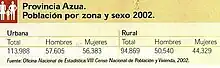 Como se puede evidenciar en el cuadro anterior, en Azua los hombres representan el 52 por ciento del total de los habitantes, mientras que las mujeres suman el 48 por ciento. Este predominio de la población masculina en la provincia es más acentuando en la zona rural que en la urbana. Esto se explica por la importante emigración de mujeres trabajadoras hacia los países europeos y hacia la capital del país