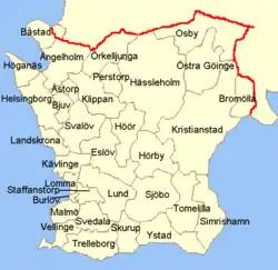 Limita al oeste con el Öresund, al norte con las provincias de Halland y Småland, al noreste con Blekinge y al sur y al este con el mar Báltico.