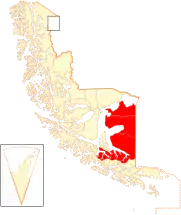 ![]() Ubicación de la Provincia de Tierra del Fuego en la Región de Magallanes y de la Antártica Chilena. | ||