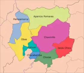 Los distritos de Chacabamba, Cahuac, Obas y Pampamarca se ubican en el margen oeste del río Marañón, mientras que los distritos de Choras, Chavinillo, Jacas Chico y Aparicio Pomares están en el margen este del río mencionado. La parte oriental del distrito de Obas se asienta sobre una parte del margen este y el distrito de Jacas Chico se asienta en una parte del flanco oriental de la Cordillera Central dando para el río Huallaga. Esta característica se repite cuando el Marañón toma rumbo noroeste ingresando a la provincia de Huamalíes luego de cruzar la vecina provincia de Dos de Mayo.