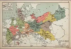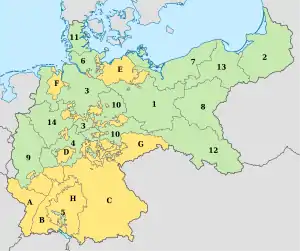 1.-Brandeburgo, 2.-Prusia oriental, 3.-Hanóver, 4.-Hesse-Nassau, 5.-Hohenzollern, 6.-Holstein, 7.-Pomerania, 8.-Posen, 9.-Renania, 10.-Sajonia, 11.-Schweswig, 12.-Silesia, 13.-Prusia occidental, 14.-Westfalia Otros estados del Imperio alémán.