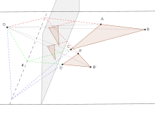 Cualquier par de triángulos homotéticos puede verse como una imagen por proyección central de un par de triángulos homotéticos entre sí o resultado de una traslación.[25] Simplemente, basta con tomar un plano paralelo al plano que contiene a (d) y pasa por O. Por proyección central en este plano las imágenes rectas de (AB) y (A'C') (respectivamente de (BC) y (B'C'), de (CA) y (C'A') son paralelas entre sí. Esta correspondencia permite relacionar la versión proyectiva y la versión afín del teorema de Desargues.[26]