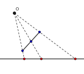 - Usando el espacio proyectivo, lo que consiste en señalar que siendo la proyección una homografía, conserva, como toda aplicación proyectiva, la razón doble. Para demostrar que una aplicación proyectiva conserva la razón doble, Audin[17] recuerda que una homografía de una recta sobre una recta está determinada por la imagen de 3 puntos, define la razón doble de los puntos ABCD, como la imagen de D por la homografía de la línea proyectiva ("AB") sobre la línea proyectiva real que envía A al infinito, B a 0 y C a 1. Luego, utiliza el hecho de que el compuesto de homografías es una homografía y las caracteriza por la imagen de 3 puntos.