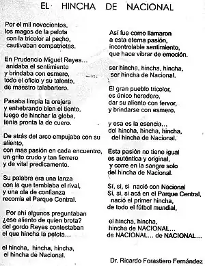 Al poco tiempo los gritos de aliento de Reyes fueron acompañados desde la grada y el coro recibió entonces el nombre de hinchada. La palabra hincha se fue aplicando a los partidarios de Nacional que más fervor mostraban en los partidos y más tarde se extendió a los demás clubes, cruzó el Río de la Plata, para luego proyectarse al resto del mundo. Tan llamativas y estruendosas eran demostraciones de aliento de Reyes, que allegados y visitantes se preguntaban: "¿Quién es ese que grita?" La respuesta era: "Ese es el hincha", "el hincha pelotas de Nacional".[5][1]