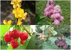 ![]() (en sentido horario desde arriba a la izquierda) Kerria japonica, Spiraea sp., Exochorda racemosa, Prunus cerasus | ||