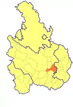 Se encuentra ubicada al este de la región, cerca de la orilla del río Morava —un afluente izquierdo del Danubio—, de la frontera con las regiones de Zlín y Moravia-Silesia, y a poca distancia al este de la ciudad de Brno.[1]
