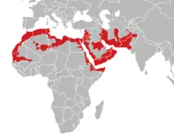 Se distribuye ampliamente en África y Asia, desde el desierto del Sahara hasta India.[3] Es una especie propia de zonas áridas.[3]