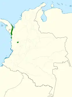 Se localiza en las tierras bajas aledañas a las serranías del Baudó y los Saltos, en el Chocó colombiano.[1][2][4] Vive en el bosque húmedo, en planicies entre el nivel del mar y los 365 m de altitud, con preferencia por los bosques sobre suelos arenosos.[2]