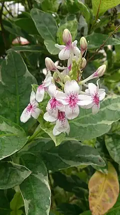 Son arbustos o árboles pequeños, que alcanzan un tamaño de hasta 4 m de alto; tallos jóvenes cuadrangulares, glabros. Esta especie tiene hojas verdes con vetas de color amarillo cremoso. Las flores son pequeñas, de color blanco con puntos púrpura-rosa que se concentran en la base de los pétalos.[2]