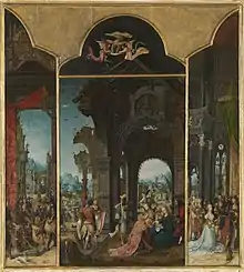 Con la pintura de Múnich se han puesto en relación un número relativamente abundante de tablas, caracterizadas todas ellas por la común pertenencia a la escuela manierista de Amberes, la elegancia y alargamiento de las figuras, dibujadas con trazo firme, y los paisajes con ruinas, ricamente decoradas con motivos ornamentales renacentistas, como se advierte en la Degollación del Bautista de la Gemäldegalerie de Berlín, o en el tríptico de la Adoración de los Magos del Museo del Prado, con las historias de El rey David recibiendo a los emisarios de las doce tribus y La reina de Saba ante Salomón en las tablas laterales, prefiguras de la visita de los magos de Oriente al Niño recién nacido.[3]