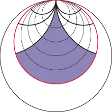 Este abierto del plano hiperbólico está bordeado por tres curvas: un trozo de horocírculo y dos geodésicas con extremo común en infinito, como muestra el dibujo. Además, el horodisco que contiene a dicho abierto se puede ver como un recubridor de infinitas hojas de media pseudoesfera.