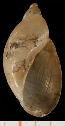 La concha de Pseudosuccinea columella es de color marrón, delgada, traslúcida, frágil y muy finamente estriada. El ápice es puntiagudo. Tiene entre 3,5 y 4 vueltas débilmente convexas, con una sutura superficial. La última vuelta es predominante con respecto a las otras. La abertura es ovalada. El margen palatal superior desciende abruptamente. El margen columelar está reflejado sólo en su sección superior; el margen columelar inferior es afilado y recto.[9]