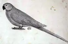 Edward Newton anotó que esperaba que el macho tuviera las alas adornadas con una mancha roja, pero la ausencia de ella indicaba que era inmaduro. Aun así lo encontró más bonito que la hembra.[6] Estos dos especímenes son los únicos ejemplares conservados de la especie.[7] Se extrajo la mandíbula y el esternón del espécimen hembra, y desde entonces se han encontrado restos subfósiles en las cuevas Plaine Corail de Rodrigues.[3] Posteriormente el género Palaeornis fue declarado un sinónimo posterior de Psittacula, por lo que toda sus especies fueron trasladadas a este último.[8]
