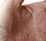 La psoriasis o soriasis[1] (AFI: [soˈɾja.sis], del griego ψώρα, picor) es una enfermedad inflamatoria crónica de la piel,[2][3] que produce lesiones escamosas engrosadas e inflamadas, con una amplia variabilidad clínica y evolutiva. No es contagiosa, aunque sí puede ser hereditaria.