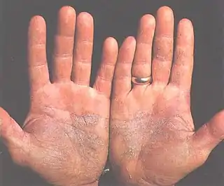![]() Placas de psoriasis en las palmas de las manos. | ||